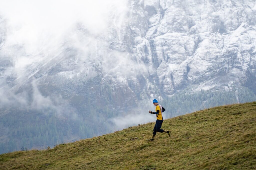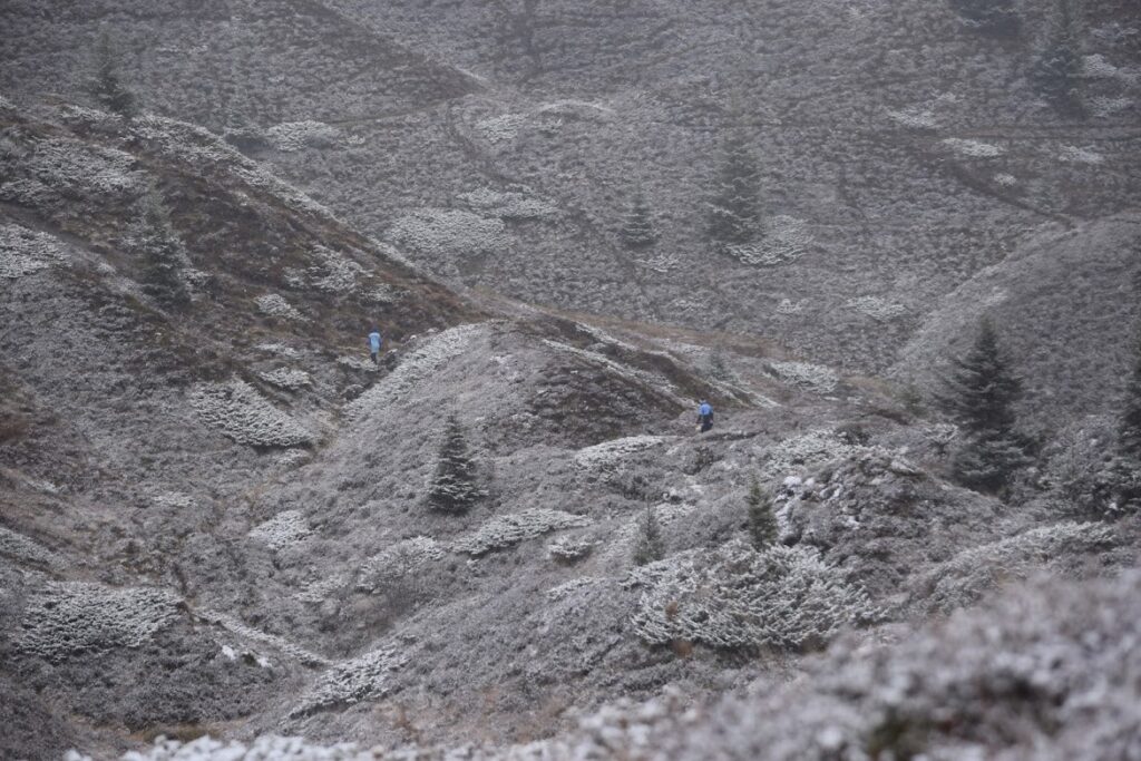 La météo s’est considérablement refroidie pour la longue distance du dimanche. De l’arrêt du bus jusqu’au départ, on a droit à 1h pour faire les 2,1 km et 180 mètres de montée. Il faut gérer, car il neige…J’ai eu la bonne idée de prendre des gants, une casquette, un tour de cou, un T-shirt longue manche en mérinos et le T-shirt longue manche du club liégeois. Au coin abrité d’une ferme, je tombe sur Sebastiaan Loosen d’Omega, qui est chercheur en architecture à l’université de Zürich. Il y a donc au moins trois Belges au départ.